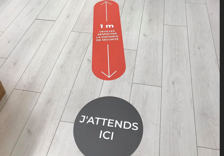 Les adhésifs de sols personnalisés pratique pour orienter et guider vos clients dans votre magasin ou commerce, et mantenir les distances de securité!